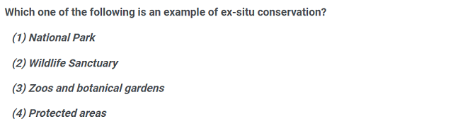 • (3) Zoos and botanical gardens: Organisms are kept outside their natural habitat. Correct Answer.