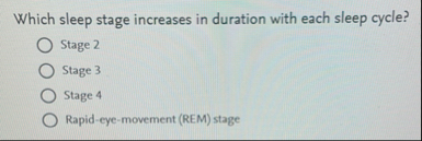 Which sleep stage increases in duration with each sleep cycle? Stage 2 Stage 3 Stage 4 Rapid – eye – movement ( REM ) stage