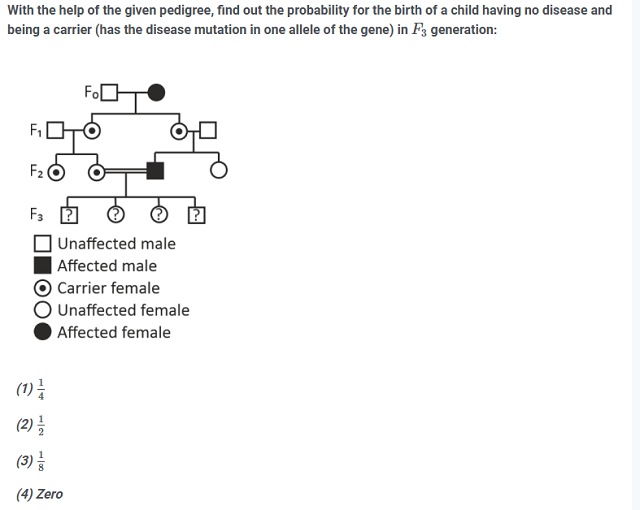 With the help of given pedigree, find out theprobability for the birth of a child having no diseaseand being a carrier (has the disease mutation in oneallele of the gene) in F3 generation.