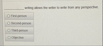 The correct answer is Third-person. This type of writing allows the author to explore the story from any character’s perspective, offering a comprehensive view of events and emotions.